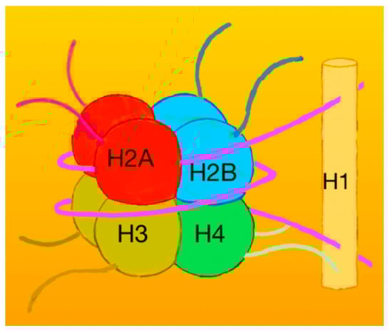 DNA of higher eukaryotes is found tightly swathed around an eight-histone complex (each of H2A, H2B, H3, and H4 are duplicated) comprising a nucleosome (Figure 7). Actually, half of the mass of a chromosome is formed by these proteins. This configuration does not only provide packaging, but also it participates in the epigenetic regulation of gene expression as well [60]. Two phases of chromatin interchange: the unwrapped euchromatin, which is liable to transcription, and heterochromatin. The latter corresponds to a dense DNA–histones complex not amenable to transcription [61].