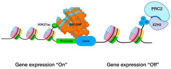 SWI/SNF molecules (CBAF, PBAF, and NcBAF) are situated at loci of acetylated histones H3K27ac. Acetylation of histones provides relaxation and enhancement of transcription. At these sites, transcription is vivid and chromatin is “open”. Promoter activity is related to the methylation status of chromatin, which regulates the elevation or suppression of the genes. These actions conflict with PCR2, which trimethylates H3 at location K27 and stabilizes chromatin through its unit EZH2.