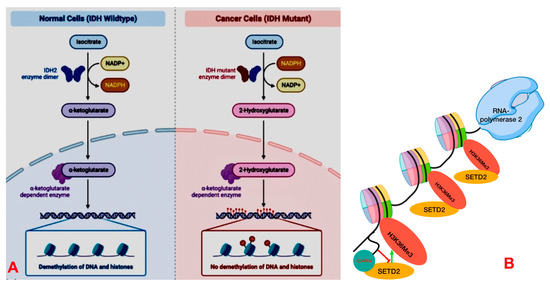 SETD2 restores chromatin and maintains transcription by methylating histone H3 on lysine 36 (H3K36). Mutations on H3G34 (arginine or valine instead of glycine) modify the transcriptional and epigenetic status [76] (Figure 9B).