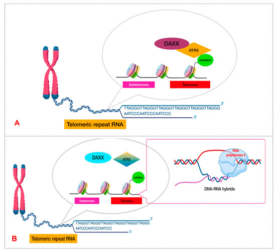 (A) The ATRX/DAXX complex acts as a stabilizer of chromatin at the center of chromatin. Similar is the rule for telomeres and subtelomeres. The presence of H3K9Me3 and the telomeric repeat of RNA are responsible for this. (B) When ATRX is not present, telomeric repeats of RNA increase and DNA–RNA hybrids appear. They inhibit telomere replication and induce recombination processes along with an abnormal alternative lengthening (ALT).