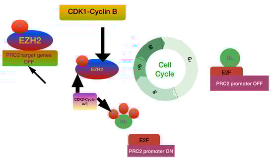 At the beginning of the G1 phase, Rb remains unphosphorylated and attached to the E2F transcription factor. G1/S passage depends on the CDK2 ignition by Cyclin E. The beginning of the S period warrants the transcription of E2F target genes, which are associated with Rb phosphorylation. The latter is the result of Cyclin E1/2-CDK2 when the G1 period culminates [80]. Cyclin E decomposes, and Cyclin A, necessary for DNA replication, substitutes it. Therewith, the passage from the S to the M period occurs [81]. CDK1-Cyclin promotes transition into M phase. Hypophosphorylated Rb remnants form a complex with E2F1, which inhibits the transcription factor’s action associated with S-phase [80].
