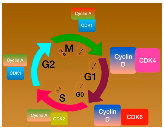 The cell’s sequential phases secure the equal allocation of the genome into two descendant cells. The consecutive phases are actually four: G1 phase (gap1 phase), S phase (synthesis phase), G2 phase (gap2 phase), and M phase (mitosis) [79]. After cycle completion, cells may transit to an inert phase recognized as G0. At the G1 phase, D-type cyclins (D1, D2, and D3) are encoded and activate the Cyclin D-CDK4/6 complex. The latter deactivates, through phosphorylation, the retinoblastoma protein (pRb), which detaches from E2F transcription factor. This factor, together with Rb, previously constituted a complex that hindered the passage from the G1 phase to the S phase [79] (Figure 12).