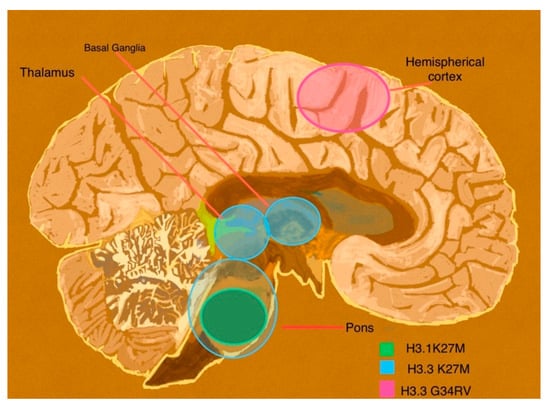 HGGs are grade III and IV gliomas. They comprise 15–20% of all pediatric cerebral neoplasms. Their 24-month survival rate is confined between 10 and 30%. These tumors do not undergo malignant evolution from LGG, in contrast to adult HGGs. They carry mutations in the genes expressing histone H3.3 and H3.1 [57] (Figure 6). Histones are protein complexes that are a part of the nucleosomes and regulate chromatin wrapping. Oncogenic mutations in histones, now termed “oncohistones”, are the molecular hallmarks of pediatric HGGs and appear in histone H3 [58]. There is a characteristic spatial association between specific mutations and the anatomic site of development. The outcome of these mutations is the derangement of the methylation process, which usually results in global hypomethylation states [59].