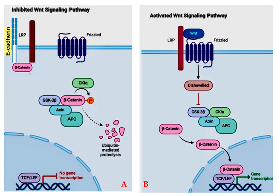 Cyclins are supervisory protein substrates with high specificity for their fermentation partner CDKs. The latter are proline-directed serine/threonine-protein kinases. They have a two-lobed configuration and modulate the shift during the cell phases [82]. The alterations undergo the supervision of transcription factors (TFs) or regulatory proteins like pRb, which suppress transcription [83]. The retinoblastoma 1 (RB1) gene is located at 13q14.p16. It is also encountered as either p16INK4 or CDKN2A. Loss of function of pRb leads to the disinhibition of proteins necessary for either the S period or mitosis [83] (Figure 13).