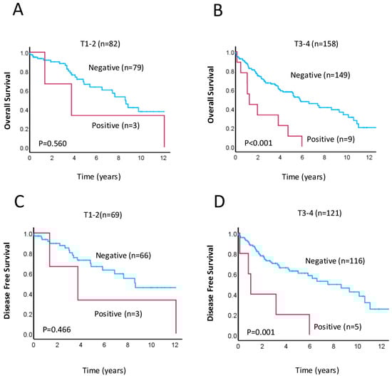 Kaplan–Meier survival analyses for patients grouped by tumor stage, with positive (red lines) vs. negative (blue lines) stone-like structure LC3A staining in the tumor periphery. (A,B) Overall survival and (C,D) disease-free in patients with early-stage (T1–T2; A,C) and advanced-stage (T3–T4; B,D) disease. Significance was determined using the log–rank test, and p-values are shown.