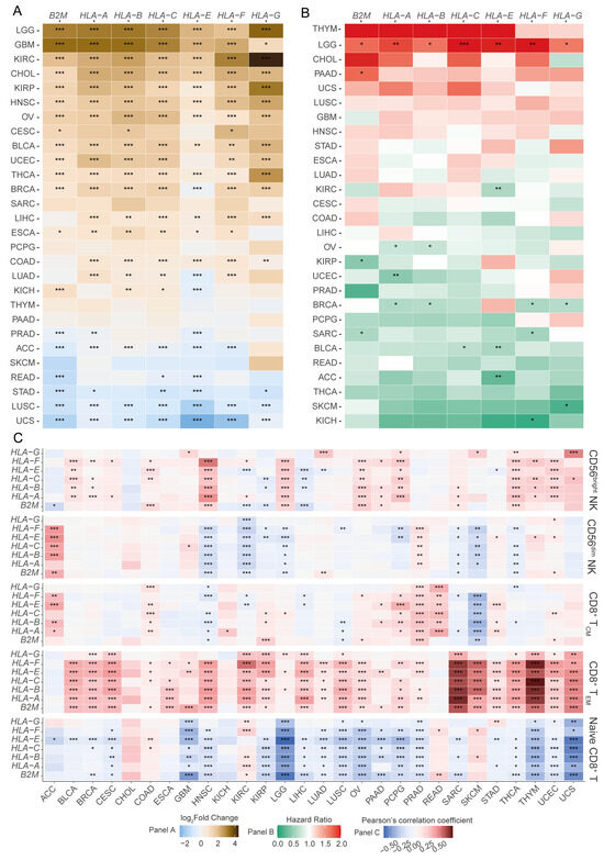 A pan-cancer screen reveals the landscape of altered expression of HLA-I encoding transcripts. (A) Differential expression of transcripts encoding HLA-I molecules across solid tumours compared to tumour-adjacent or normal tissues (Wilcoxon signed-ranked test); (B) risk stratification of HLA-I molecules using the Cox proportional hazards model; (C) association of transcripts encoding HLA-I molecules and the abundance of CD8+ T cell subsets (naïve, effector memory, and central memory) and NK cell subsets (CD56bright and CD56dim) (Pearson’s correlation coefficient). (*** p-value < 0.001, ** p-value < 0.01, and * p-value < 0.05) (ACC: adrenocortical carcinoma; BLCA: bladder urothelial carcinoma; BRCA: breast invasive carcinoma; CESC: cervical squamous cell carcinoma and endocervical adenocarcinoma; CHOL: cholangiocarcinoma; COAD: colon adenocarcinoma; DLBC: lymphoid neoplasm diffuse large B-cell lymphoma; ESCA: oesophageal carcinoma; GBM: glioblastoma multiforme; HNSC: head and neck squamous cell carcinoma; KICH: kidney chromophobe; KIRC: kidney renal clear cell carcinoma; KIRP: kidney renal papillary cell carcinoma; LAML: acute myeloid leukaemia; LGG: brain lower-grade glioma; LIHC: liver hepatocellular carcinoma; LUAD: lung adenocarcinoma; LUSC: lung squamous cell carcinoma; MESO: mesothelioma; PAAD: pancreatic adenocarcinoma; PCPG: pheochromocytoma and paraganglioma; PRAD: prostate adenocarcinoma; READ: rectum adenocarcinoma; SARC: sarcoma; SKCM: skin cutaneous melanoma; STAD: stomach adenocarcinoma; THCA: thyroid carcinoma; UCEC: uterine corpus endometrial carcinoma).