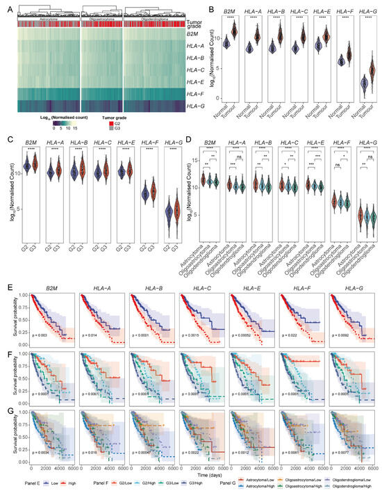 HLA-I-encoding transcripts are aberrantly expressed in TCGA LGG tumours. (A). Heatmap of the expression of HLA-I-encoding transcripts in TCGA-LGG patients stratified by glioma grade. (B) Violin plots comparing the expression of HLA-I transcripts in tumours versus normal brain tissue; HLA-I transcript abundance across (C) different clinical grades and (D) glioma molecular subtypes; (E) KM survival curves illustrating the prognostic implications of the HLA-I expression in LGGs; Prognostic association of HLA-I expression across (F) tumour grades and (G) glioma subtypes. (**** p-value < 0.0001, *** p-value < 0.001, ** p-value < 0.01, and * p-value < 0.05, ns: non-significant for Wilcoxon signed-ranked test for panels (B–D)).