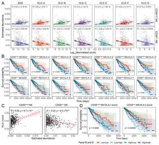 The abundance of HLA-I-encoding transcripts is negatively associated with the transcriptional signature of CD56dim NK cells. (A) Scatter plots showing the associations between HLA-I transcript expression and CD56bright and CD56dim NK cell abundances in TCGA LGG tumours (Pearson’s correlation coefficient). (B) Combined KM curves illustrating the prognostic implications of HLA-I expression and NK cell abundance in LGGs. (C) Correlation between the combined HLA-I scores and estimated NK subset abundances (Pearson’s correlation coefficient). (D) Impact of the total HLA-I transcript load on LGG patient survival in the context of NK cell transcriptional signatures.