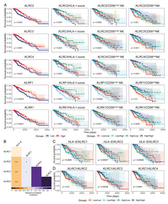 HLA-I expression in LGG tumours is negatively correlated with transcripts encoding activating members of the killer cell lectin-like receptor (KLR). (A) Prognostic significance of selected KLRs, both individually and in combination with HLA-I transcript loads and NK subset signatures, in TCGA LGG patients; (B). Correlation heatmap illustrating the association between KLRC1 (NKG2A), KLRC2 (NKG2C), KLRC3 (NKG2E), KLRC4 (NKG2F), and HLA-E expression in LGG tumour transcriptomes (Pearson’s correlation coefficient). (C) KM curves showing the combined prognostic relevance of HLA-E and transcripts encoding KLR family receptors; (D). KM curves demonstrating the combined prognostic impact of activating and inhibitory NKG2x receptor transcripts. (*** p-value < 0.001 and * p-value < 0.05 for Pearson’s correlation coefficient scores).