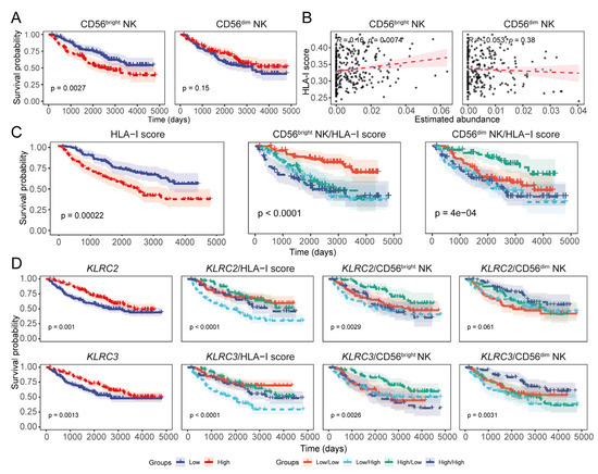 Since a potential association of HLA-I expression with the abundance of NK subsets was evident, we next asked whether the expression of activating NK cell receptors and HLA-I was associated with LGG patient survival. We observed that increased abundance of KLRC2 (NKG2C), KLRC3 (NKG2E), KLRC4 (NKG2F), KLRF1 (NKp80), KLRK1 (NKG2D), B3GAT1 (CD57), and SELL (CD62L) was associated with favourable LGG patient survival (Figure 5A and Figure S6). Interestingly, patients with a high abundance of these receptor-coding transcripts and high CD56dim NK abundance were predicted to have improved survival potential (Figure 5A and Figure S6), emphasising the possible role of these activating receptors in mediating the anti-tumour functions of CD56dim NK cells in this setting [65]. Furthermore, a negative association between these receptors and HLA-I expression was evident with respect to patient survival, as only the group of patients with high transcript expression of these activating receptors and low HLA-I expression had favourable survival outcomes (Figure 5A and Figure S6).