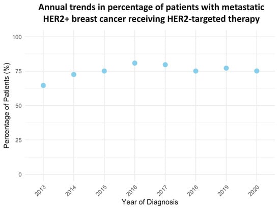 Annual trends in the use of HER2-targeted therapies among metastatic HR−/HER2+ breast cancer patients from 2013 to 2020 (p < 0.001 by fitting the data to a linear trend).