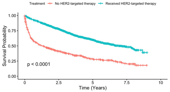 Kaplan–Meier survival curves were generated to compare overall survival between patients who received HER2-targeted therapies and those who did not, with the log-rank test used to test for significance. Cox regression was conducted to assess the impact of use of HER2-targeted therapies on overall survival while controlling for clinical, sociodemographic, and facility-related characteristics.