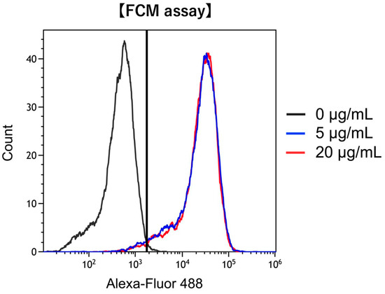 To confirm whether FAP was expressed on hPSC-5 cells as observed on CAFs, we used anti-FAP antibody-AlexaFluor®488 conjugate and performed quantitative analysis using flow cytometry. As shown in Figure 1, the binding rate of anti-FAP antibody-AlexaFluor®488 conjugate at 5 µg/mL to hPSC-5 cells was 94%, whereas that at 20 µg/mL was 95%. The binding rate did not change even when the reagent concentration was changed to 5 µg/mL and 20 µg/mL, indicating that FAP was sufficiently expressed on the hPSC-5 cell surface.