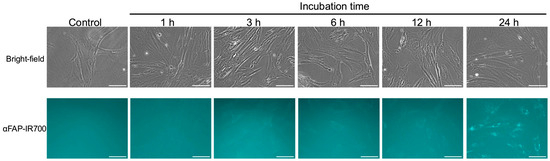 After confirmation of sufficient FAP expression on the hPSC-5 cell surface by the anti-FAP antibody-AlexaFluor®488 conjugate, we also investigated whether αFAP-IR700 and the anti-PDPN antibody-IR700 conjugate were bound to hPSC-5 using a fluorescence microscope. As the incubation time of αFAP-IR700 with hPSC-5 cells increased, fluorescence intensity also increased (Figure 2). Although fluorescence was detected after 1 h of incubation, maximal fluorescence was observed on the surface of hPSC-5 cells after 3 h of incubation. After 6 h of incubation, bright granular spots were observed. These results indicate that αFAP-IR700 was internalized into lysosomes over time. Namely, binding of αFAP-IR700 and the anti-FAP antibody-AlexaFluor®488 conjugate to hPSC-5 cells was also observed (Figure 2). Fluorescence due to bindings of αFAP-IR700 and anti-PDPN antibody-IR700 conjugate to PDAC cells was not detected (Figure S1). Unfortunately, fluorescence due to binding of the anti-PDPN antibody-IR700 conjugate to hPSC-5 cells was also not observed (Figure S2).