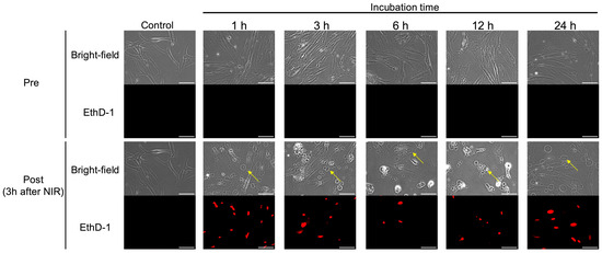 Microscopic observation of NIR-PIT for hPSC-5 cells using αFAP-IR700 in vitro. At 3 h after the end of irradiation, cell swelling (yellow arrow) and nuclear staining with EthD-1 (red) were observed under a bright-field and fluorescence microscope, indicating cell death induced by NIR-PIT at all incubation times. Scale bar: 100 µm (original magnification, 20×).