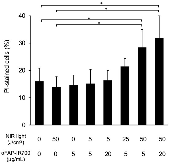 Figure 4 shows the quantitative evaluation of the effect of NIR-PIT on hPSC-5 cells using αFAP-IR700 by flow cytometry. Compared with the control group (αFAP-IR700, 0 μg/mL with NIR, 0 J/cm2), significant cell death was observed in the NIR-PIT group (αFAP-IR700, 5 and 20 µg/mL with NIR, 50 J/cm2) (n = 5, * p < 0.05 vs. control). In addition, cell death was observed in the NIR-PIT group with lower irradiation (αFAP-IR700, 5 μg/mL with NIR, 25 J/cm2), although the level of cell death was not significant compared with that in the control (n = 5, p = 0.31 vs. control). There were no significant differences between the other groups and the control (NIR, 50 J/cm2 alone, p = 1; αFAP-IR700, 5 μg/mL alone, p = 1; αFAP-IR700, 5 μg/mL with NIR, 5 J/cm2, p = 1; αFAP-IR700, 20 μg/mL with NIR, 5 J/cm2, p = 1).