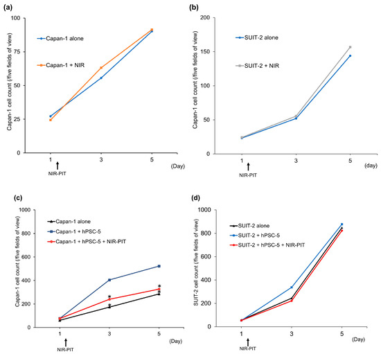 Confirmation of PDAC cell proliferative ability. (a) Capan-1 cells without hPSC cells similarly proliferated irrespective of NIR-PIT using αFAP-IR700. (b) SUIT-2 cells without hPSC cells also similarly proliferated irrespective of NIR-PIT using αFAP-IR700. (c) Capan-1 cells co-cultured with hPSC-5 cells proliferated faster than Capan-1 cells cultured alone. When hPSC-5 cells were treated with NIR-PIT, the proliferative ability of Capan-1 cells decreased to the same level as that of the Capan-1 cell group (each group, n = 4, * p < 0.05 vs. Capan-1 cells alone). (d) In SUIT-2, there was no effect of hPSC-5 and NIR-PIT on cell proliferation of SUIT-2 (each group, n = 4, p = 1 vs. SUIT-2 cells alone).