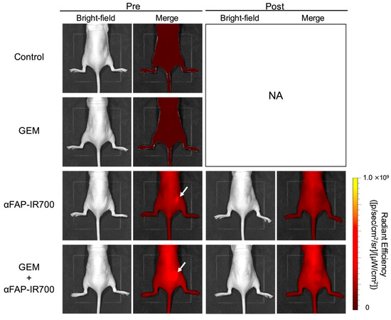 In vivo NIR-PIT by αFAP-IR700 in a murine model with Capan-1 + hPSC-5 cells. In both the αFAP-IR700 group and the NIR-PIT with GEM group, accumulation of αFAP-IR700 in the tumor was observed before NIR-PIT (white arrow). After NIR irradiation, fluorescence due to αFAP-IR700 accumulation disappeared in both groups. NA, not assessed.