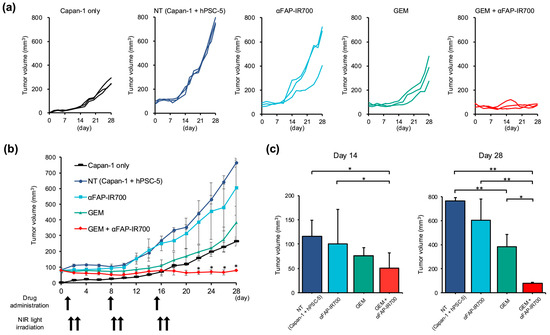 Tumor volumes of in vivo NIR-PIT by αFAP-IR700 in a murine model with Capan-1 + hPSC-5 cells. (a) Spider plot of Capan-1 cells alone, NT (Capan-1 + hPSC-5 cells), NIR-PIT with αFAP-IR700 monotherapy group, GEM alone, and combination groups with GEM plus NIR-PIT with αFAP-IR700, respectively. (b) Changes in tumor volume over time. Compared with the Capan-1 cell group, the NT group (Capan-1 + hPSC-5 cell group) showed significantly greater tumor growth. In addition, when the treatment was examined by type, the group that received NIR-PIT in combination with GEM showed a significant cancer-reducing effect compared to the group that received GEM alone (n = 3, * p < 0.05). (c) Comparison of tumor volume on treatment days 14 and 28: On day 14, tumor volume was significantly reduced in the GEM plus NIR-PIT group compared with that in the NT group and αFAP-IR700 monotherapy group. On day 28, tumor volume was significantly reduced in the GEM plus NIR-PIT group compared with that in the GEM group (n = 3, * p < 0.05, ** p < 0.01).