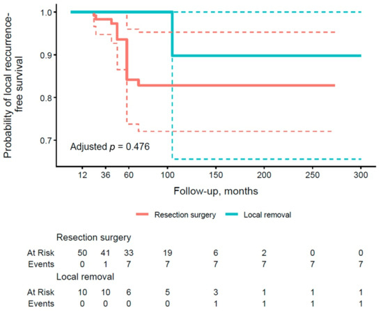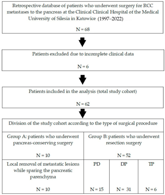 Methods: We retrospectively analyzed data from 62 patients with RCC metastases to the pancreas who underwent pancreatic surgery at the Department of Gastrointestinal Surgery, Medical University of Silesia, Katowice. Patients were divided into two groups: those who underwent local tumor removal (group A, N = 10) and those who underwent classical pancreatic resection (group B, N = 52). Demographic data, postoperative course, histological findings, and clinical outcomes—recurrence-free survival (PFS) and overall survival (OS)—were analyzed.