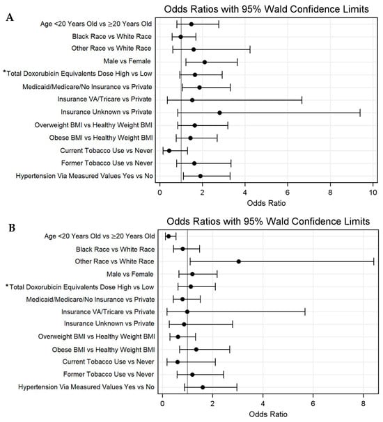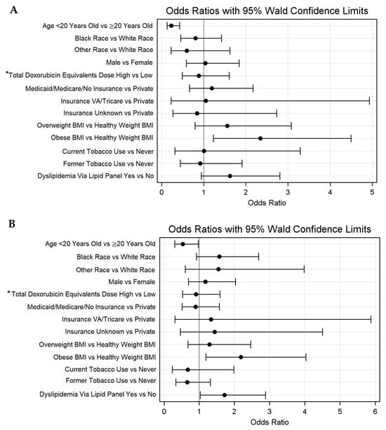The median age at the most recent lipid panel was 28.1 years (IQR 18.1–38.3), with 31.5% of individuals (n = 87) being < 20 years old. The median time from the cancer diagnosis to the lipid panel was 3.9 (1.9–7.0) years. Among the total population, 52.9% (n = 146) met the criteria for dyslipidemia via lipid panels. HDL (35.9%) and TGs (34.7%) were the most commonly abnormal lipids (Supplementary Table S1). The regression analysis identified several variables associated with increased odds of dyslipidemia via lipid panels, including male sex (OR = 2.1, 95% CI 1.2–3.7), Medicaid/Medicare/Not Insured (OR = 1.9, 95% CI 1.1–3.3), and patients with hypertension via measured values (OR = 1.9, 95% CI 1.1–3.3). The odds of dyslipidemia via measured values were not associated with age or a non-White race. The high total doxorubicin equivalent dose (OR = 1.7, 95% CI 0.9–2.9) and past tobacco use (OR = 1.6, 0.8–3.4) demonstrated non-significant trends toward a higher odds of dyslipidemia (Figure 1A, Supplementary Table S2). Regarding dyslipidemia via the ICD code, a younger age was associated with decreased odds of dyslipidemia (OR = 0.2, 95% CI 0.1–0.5) (Figure 1B).
