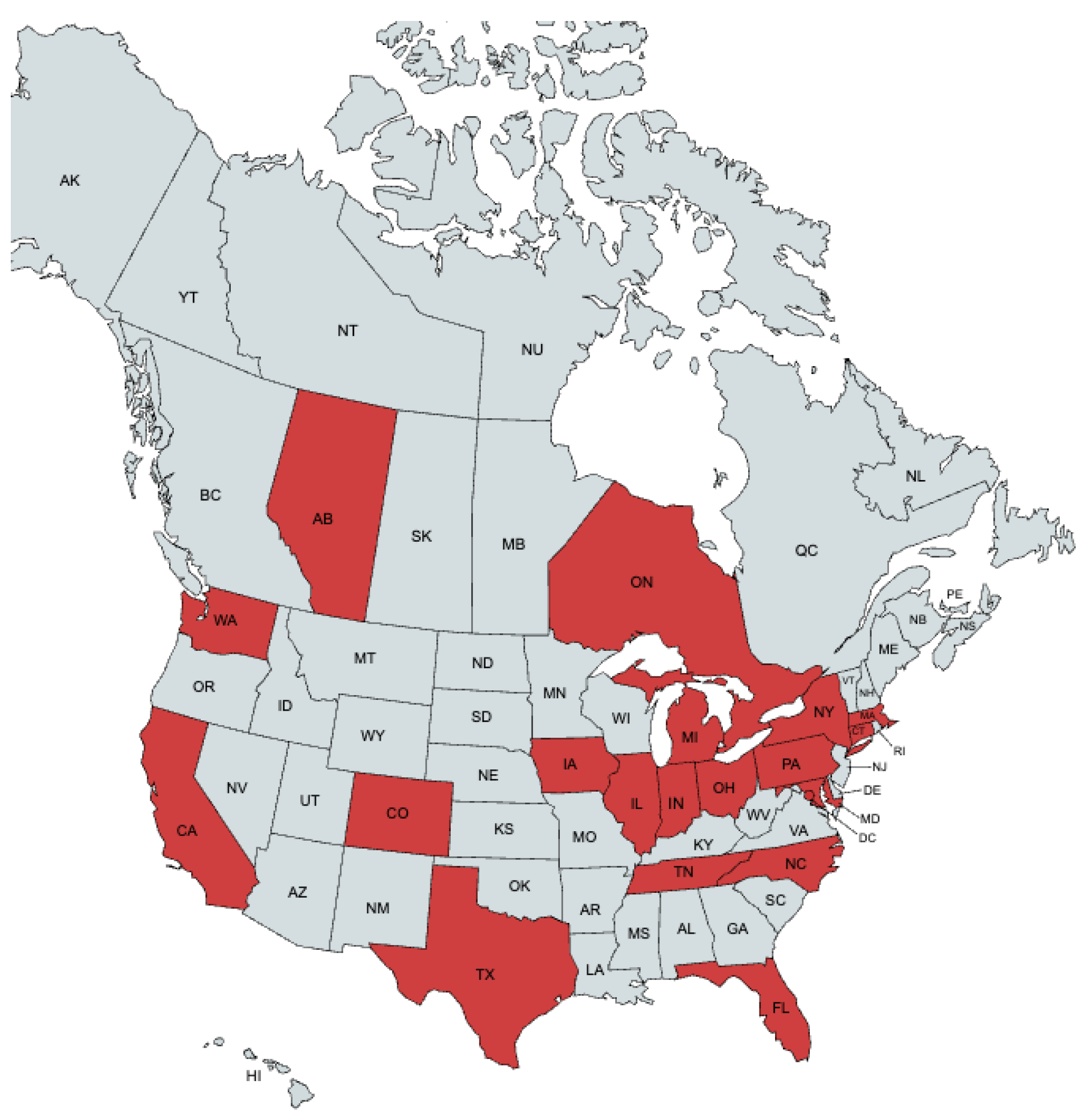 Geographic distribution of panelists. Red indicates the location of practice of a panelist.