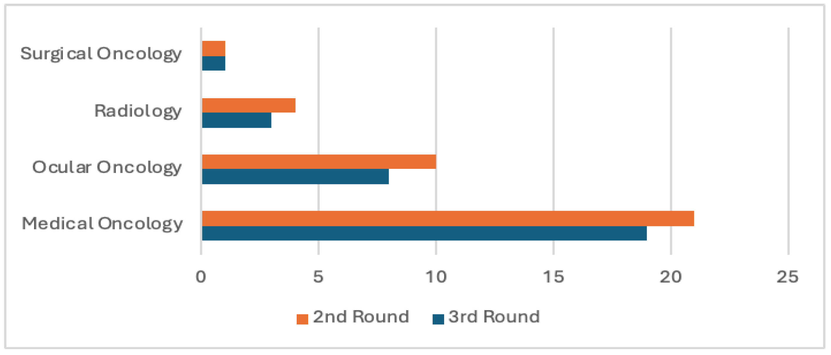 Forty-nine experts from the United States and Canada were invited to participate in this Delphi study. A total of 41 experts from 17 U.S. states, Washington D.C., and 2 Canadian provinces completed the surveys (Figure 1). Consensus was achieved after three Delphi rounds. In rounds two and three, most participants were medical oncologists (21 and 19, respectively), followed by ocular oncologists (10 and 8), radiologists (4 and 3), and surgical oncologists (1 in each round) (Figure 2).