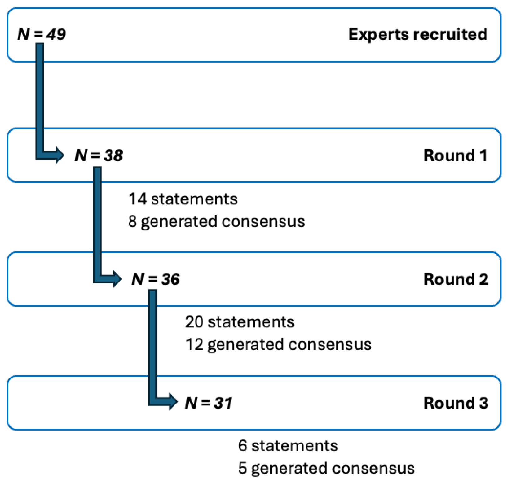 Panelists subsequently participated in a virtual debrief session to discuss areas of disagreement and provide additional written and verbal feedback. Statements that achieved consensus, defined as ≥70% of panelists scoring a statement 7 or higher, for the first time were presented again in the subsequent round to ensure stability of results. Statements that did not meet the consensus threshold were revised based on panelist feedback and reintroduced in the next round. Any statement that reached consensus across two rounds was included as a consensus statement and omitted from subsequent rounds. The process continued until the study reached its third round, at which point further rounds were deemed unlikely to provide additional meaningful consensus, and the study was concluded.