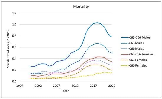 Mortality also declined in both sexes, with a greater reduction observed in men (APC −5.47) than in women (APC −4.0). An exception occurred for ureteral cancer in women, where mortality continued to rise (APC 8.2).