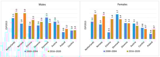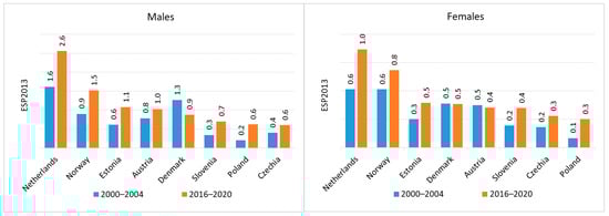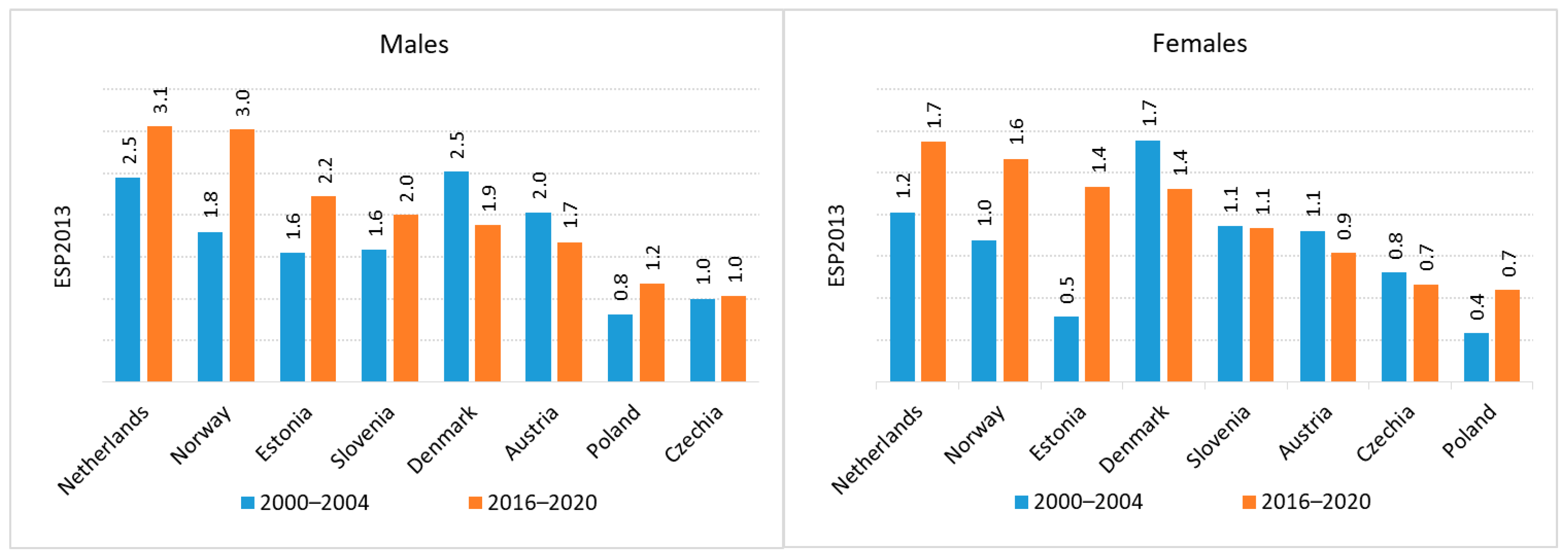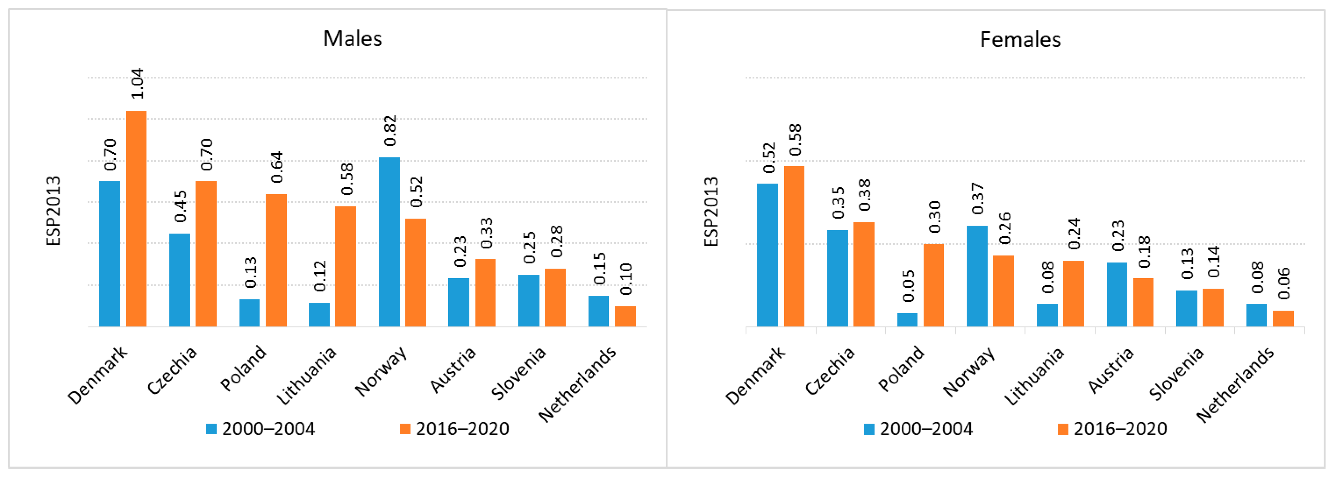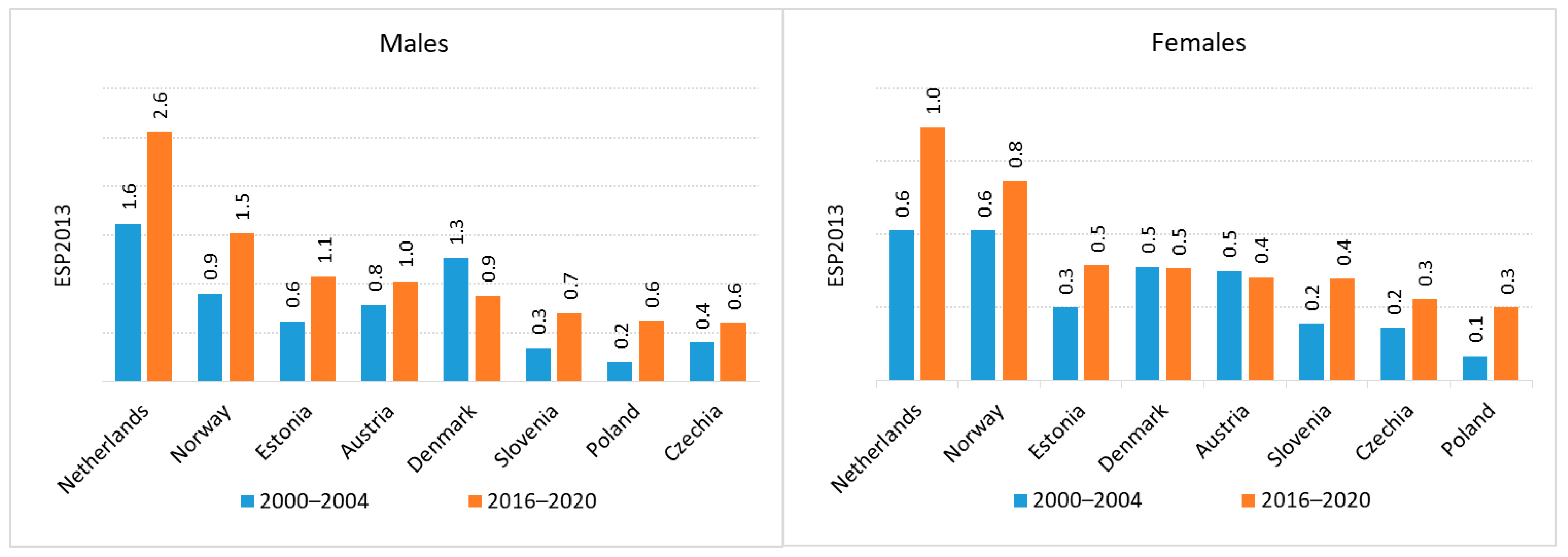 Among all European countries analyzed, the Netherlands exhibited the highest incidence of renal pelvis and ureteral cancers in both men and women (C65 age-standardized incidence rate (ASIR) in men 2.5 (2000–2004) and 3.1 (2016–2020), C65 ASIR 1.2 in women (2000–2004), 1.7 (2016–2020); C66 ASIR in men 1.6 (2000–2004) and 2.6 (2016–2020), C66 ASIR 0.6 in women (2000–2004), 1.2 (2016–2020). In contrast, the lowest incidences of C65 and C66 in men and women were recorded in Czechia and Poland, respectively (