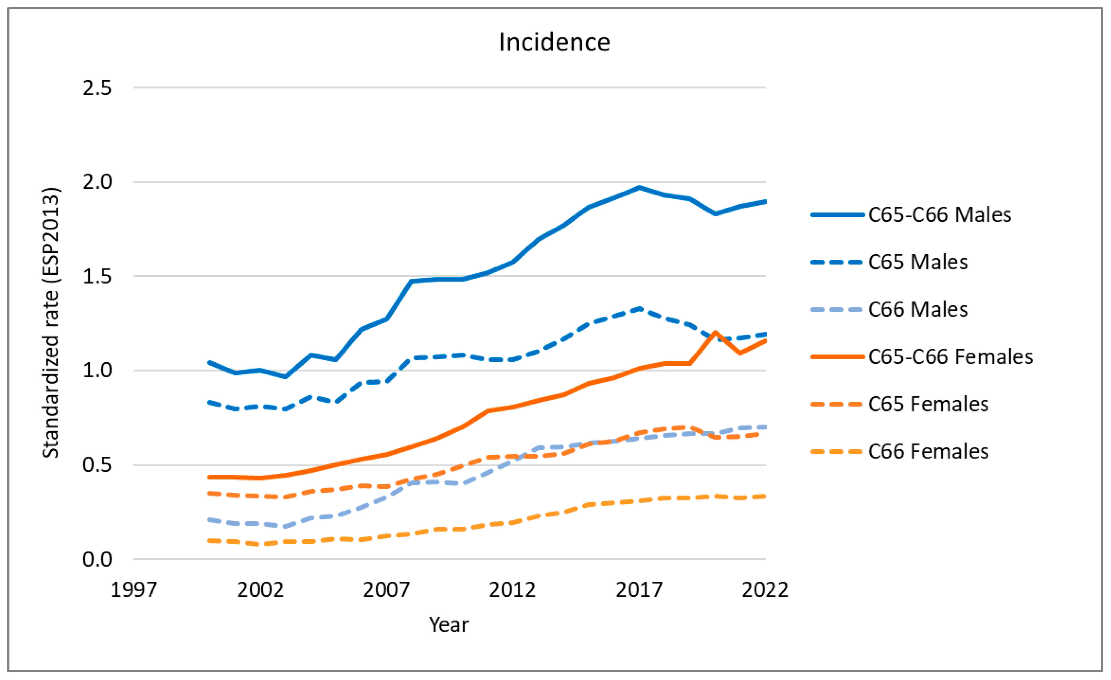 It is important to highlight that both the incidence and mortality rates for renal pelvis cancer (C65) were higher than those for ureteral cancer (C66) in both sexes.