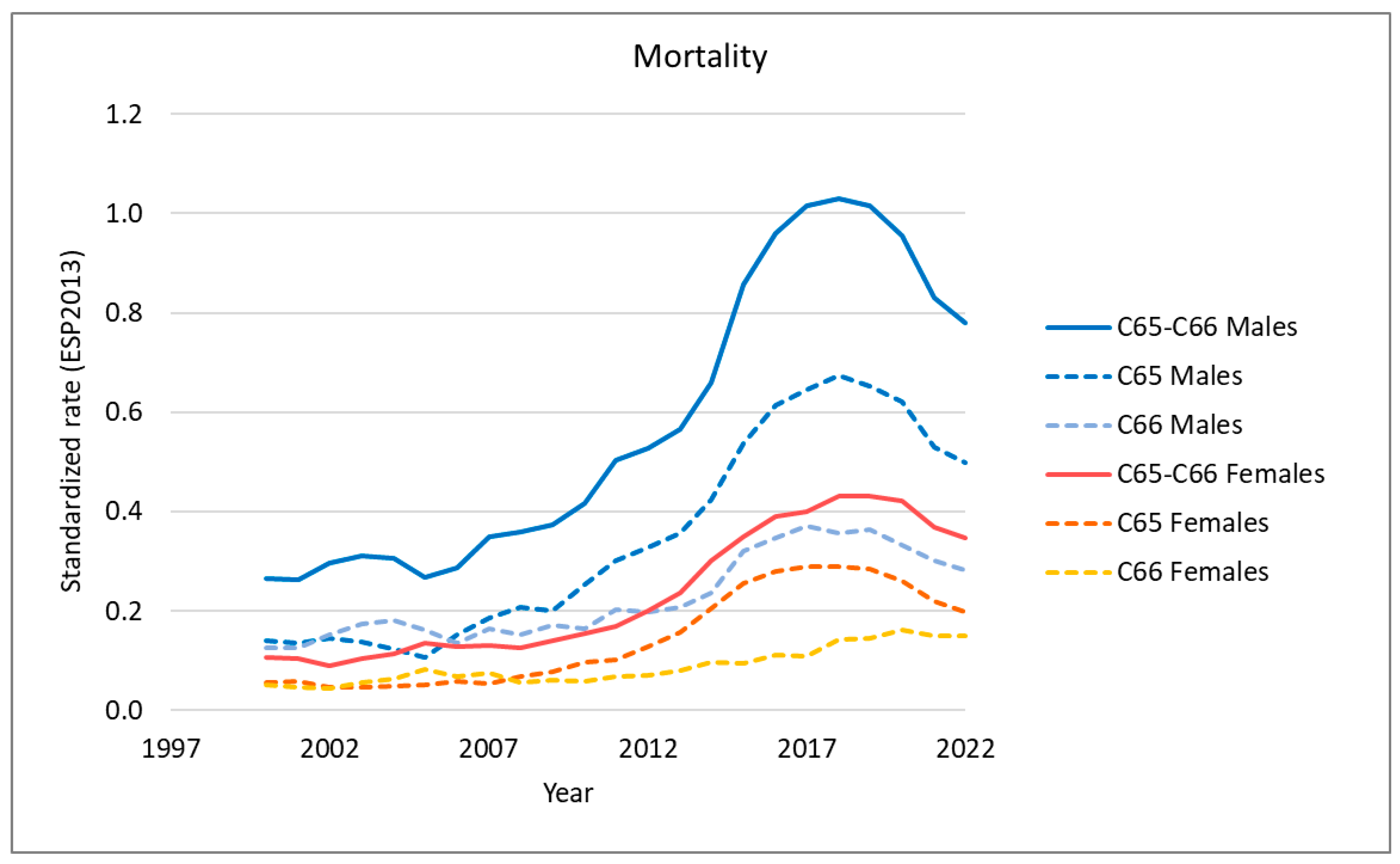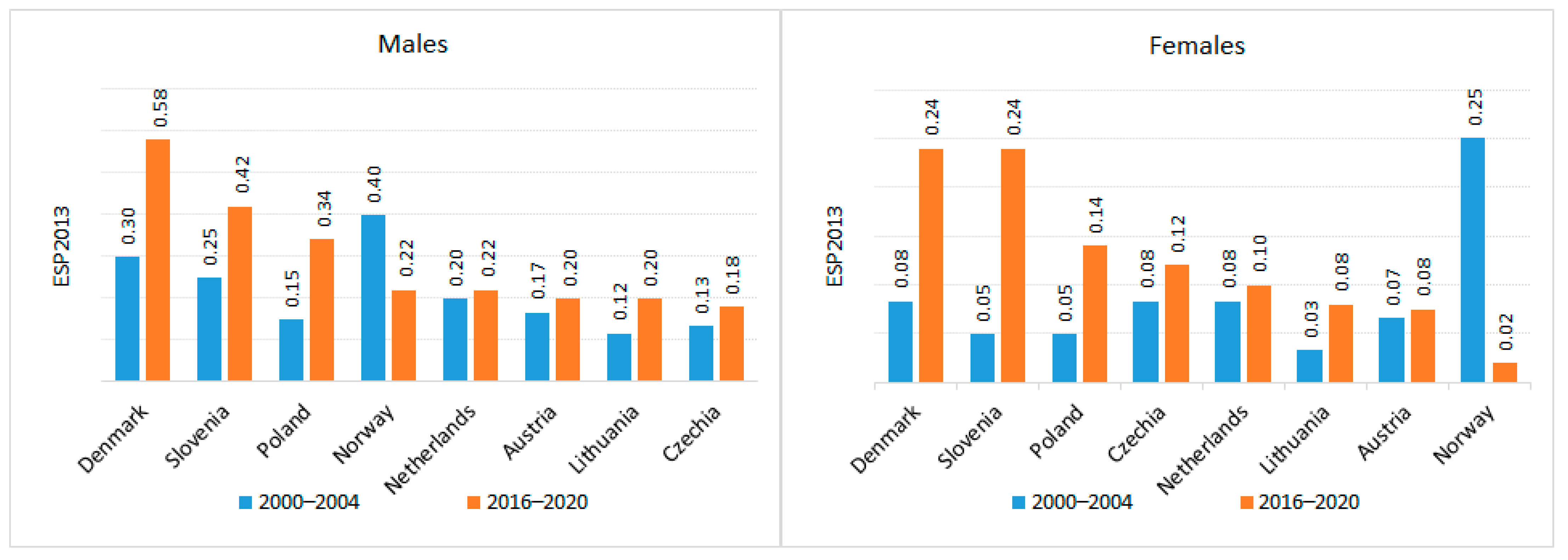 Regarding mortality, the highest death rates for both renal pelvis and ureteral cancers were recorded in Denmark (C65 age-standardized mortality rate (ASMR) in men 0.7 (2000–2004) and 1.04 (2016–2020), C65 ASMR 0.52 in women (2000–2004), 0.58 (2016–2020); C66 ASMR in men 0.3 (2000–2004) and 0.58 (2016–2020), C66 ASMR 0.08 in women (2000–2004), 0.24 (2016–2020)). The lowest mortality rates for C65 were observed in the Netherlands for both sexes (C65 ASMR in men 0.15 (2000–2004) and 0.10 (2016–2020), C65 ASMR 0.08 in women (2000–2004), 0.06 (2016–2020); while the lowest C66 mortality rates were reported among men in Czechia (0.13 (2000–2004), 0.18 (2016–2020)) and women in Norway (0.25 (2000–2004), 0.02 (2016–2020)) (