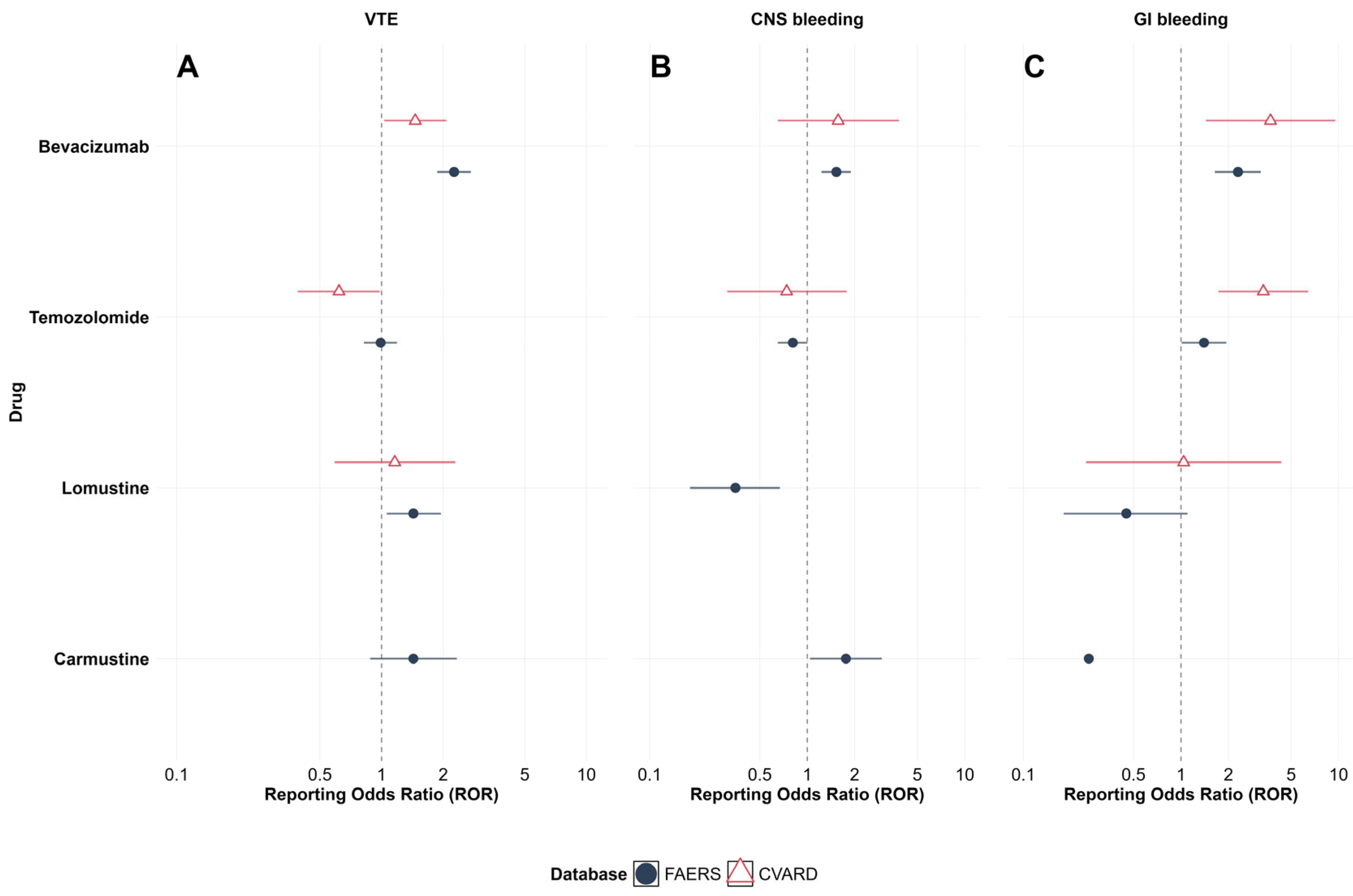 Table 3b). Bevacizumab exhibited a stronger GI bleeding signal in the CVARD (ROR 3.70, 95% CI: 1.44–9.53), while the ROR for CNS bleeding was 1.57 (95% CI: 0.65–3.82); the latter estimate was imprecise, with a wide CI crossing 1, reflecting instability due to limited case numbers. Notably, temozolomide in the CVARD was associated with a more marked GI bleeding signal (ROR 3.33, 95% CI: 1.73–6.42) compared with the FAERS, while still lacking a clear CNS bleeding signal (ROR 0.74, 95% CI: 0.31–1.78). For lomustine, only two GI bleeding reports were identified (a = 2; ROR 1.04, 95% CI: 0.25–4.33), precluding robust inference. Overall, bevacizumab demonstrated highly consistent positive signals across databases for VTE and GI bleeding, whereas a clear CNS bleeding signal was observed only in the FAERS. Temozolomide did not exhibit disproportionate VTE reporting but showed stronger GI bleeding disproportionality in the CVARD than in the FAERS, suggesting that differences in reporting structure and treatment context between databases may influence sensitivity for certain drug–event combinations.