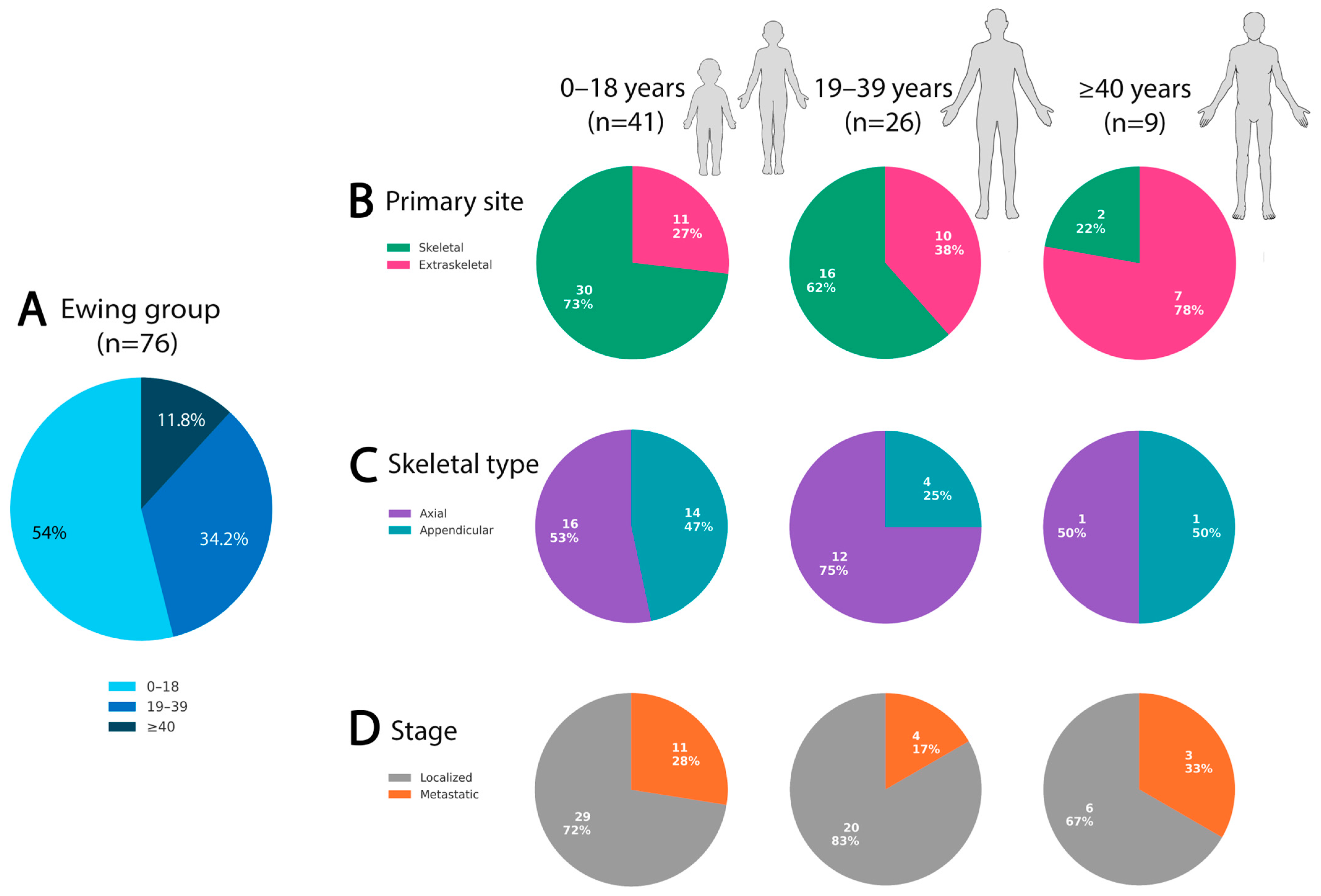 - Worch, J.; Ranft, A.; DuBois, S.G.; Paulussen, M.; Juergens, H.; Dirksen, U. Age dependency of primary tumor sites and metastases in patients with Ewing sarcoma. Pediatr. Blood Cancer 2018, 65, e27251. [Google Scholar] [CrossRef]