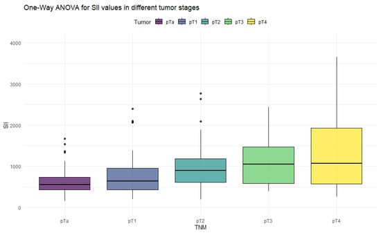 The ANOVA test with Box–Cox transformation was used to measure differences in values across different stages of bladder cancer. Figure 1, Figure 2, Figure 3 and Figure 4 provide a visual representation of the distribution of inflammation index values, and the ANOVA test results with post hoc analysis are presented in Table 3.