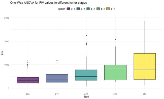 The ANOVA test showed significant differences in all inflammation indices, depending on the tumor stage. Patients with non-muscle-invasive bladder cancer had clearly lower values of inflammation indices than patients with muscle-invasive disease. PIV was the most differentiating factor, with the highest F values, reaching statistically significance in five tumor-stage comparisons. Importantly, only the PIV differed significantly between pT2 and pT4 tumors. Furthermore, p-values tended to be the lowest when comparing tumor stages using the PIV—even in non-significant comparisons.