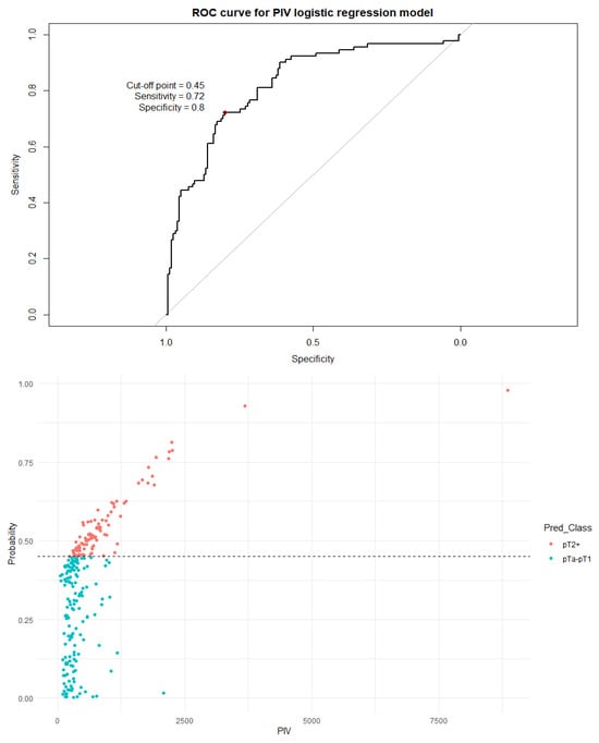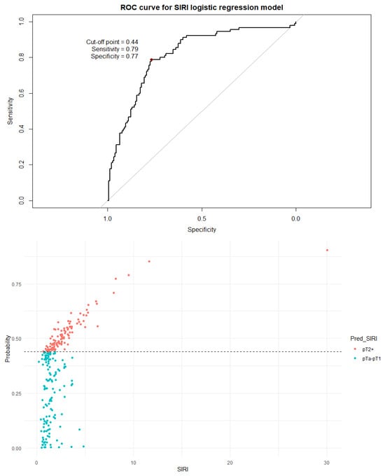 To establish cutoff values of inflammation indices, an ROC curve with Youden’s J statistic was calculated. The continuous variables were SII, SIRI, PIV, and PLRT; the binary variable was assignment to a non-muscle-invasive group (pTa + pT1) vs. a muscle-invasive group (pT2+). The results are presented in Table 5.