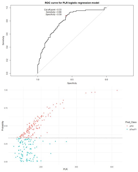 The ROC curve and distribution of analyzed data in binary logistic regression model including PLR values. The optimal cutoff calculated via Youden’s J statistic was determined to be 0.33 AUC = 0.795; sensitivity = 88%; specificity = 59%. Impact of independent variables on the model: p = 0.46 for age, p = 0.40 for sex, and p < 0.001 for both the PLR value and the number of recurrences.