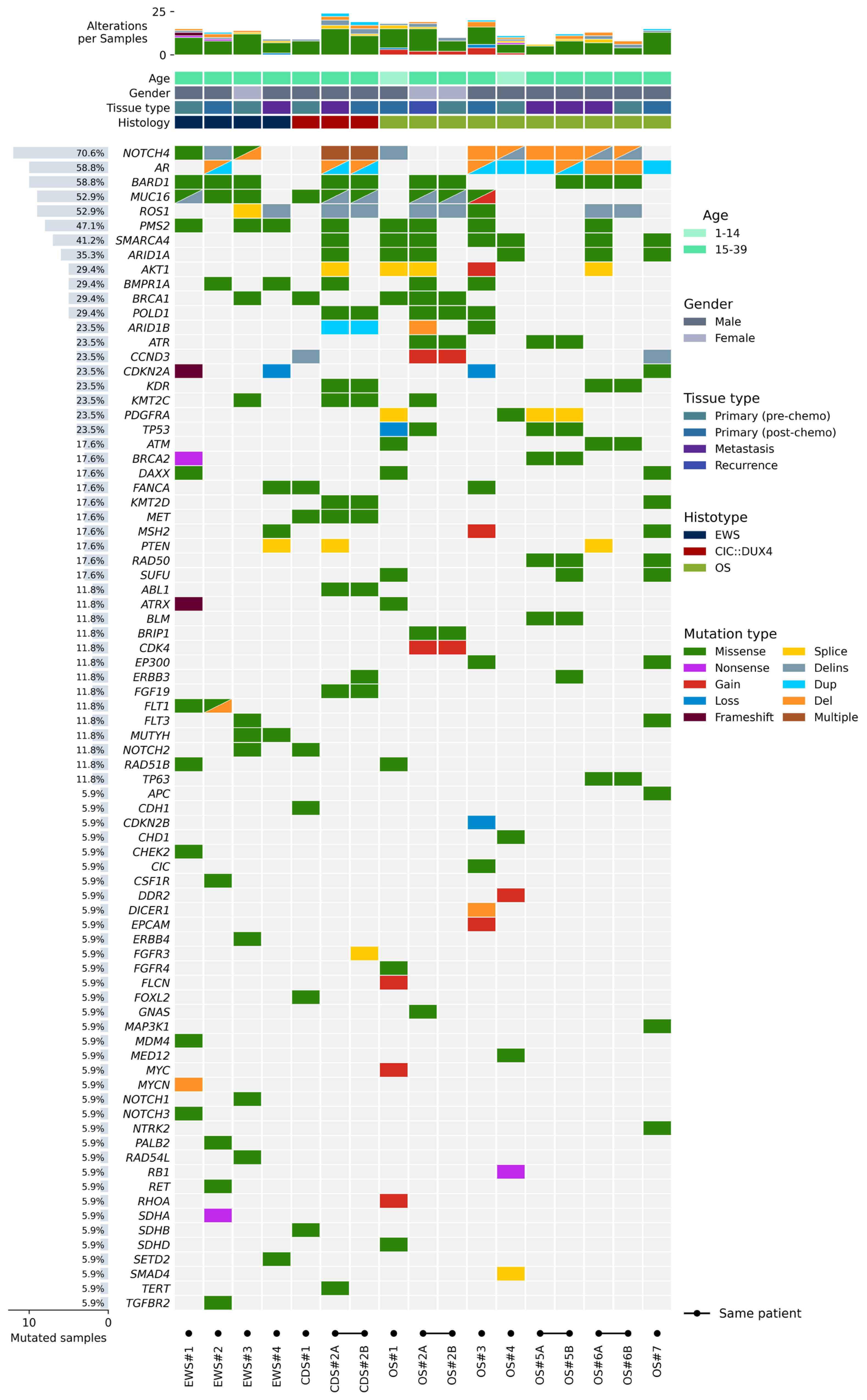 In this study, we analyzed a total of 22 patients over 3 years. In Table 1, we summarize the clinical–pathological characteristics of the patients, who were in the pediatric (0–14) and adolescent–young adult (15–39) ages, with a prevalent proportion of males compared to females. Tumors were classified according to the current WHO classification guidelines [25]. Globally, the most common histological subtype was osteosarcoma (OS), all conventional high-grade OS, followed by Ewing sarcoma (EWS), all carrying EWS::FLI1 translocation (type 1 in 1 case, type 2 in 2 cases, and not determined in 2 cases), and other rare tumors. Of note, in one CIC::DUX4 translocated sarcoma (CDS#2) and in three OS (OS#2, OS#5, OS#6) patients, two different tissue samples, taken in different stages of the progression of the disease, were available. Additionally, for nine patients, the corresponding saliva was made available, allowing for the investigation of germline DNA (Table 1). Seven out of twenty-two patients (32%) had metastatic disease at diagnosis, fourteen died of the disease (64%), one patient was lost at follow-up, and seven are alive with disease.
