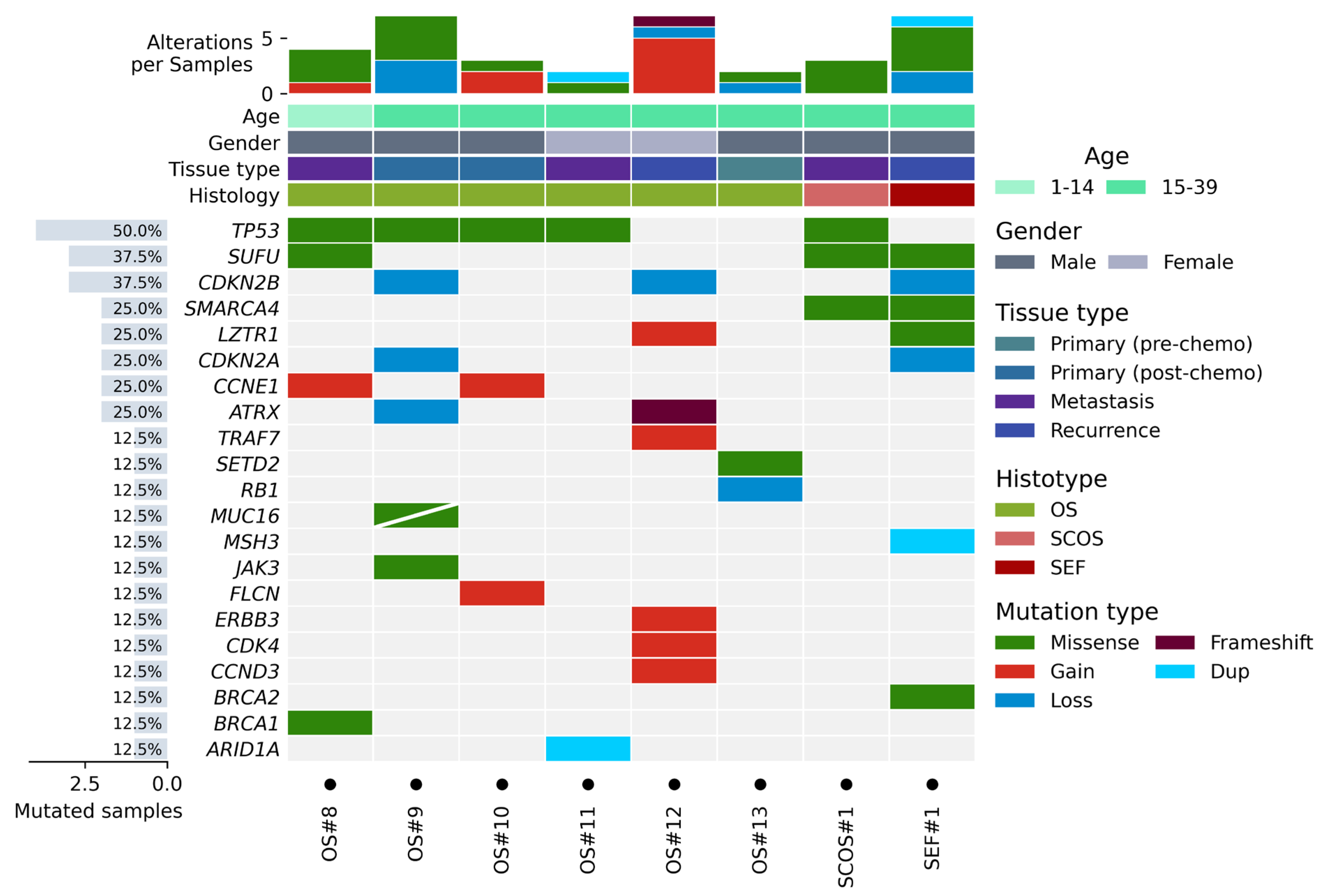 The further implementation of saliva analysis allowed for the subtraction of the preexisting germline variants. Therefore, only the variants proper of the somatic tumor sample were identified. The number of alterations discovered in the last series of cases was found, for this reason, to be lower compared to those previously retrieved in the different set of patients without matched normal sample analyses (Figure 2). The SEF sample showed the highest number of variants; the EWS sample, which did not show any alterations, was not reported in the figure. One of the most frequently altered genes was TP53, with 4 out of 6 OS (67%) samples and the SCOS sample showing missense mutations. Missense mutations were found in another tumor suppressor gene, SUFU, in 1 OS tumor and in the SCOS and SEF samples. In OS#8, the BRCA1 variant was reported, even if present in the germline sample, because the Allele Fraction of the variant in the somatic sample was drifting toward homozygosis. MSH3 and ARID1A genes showed one nucleotide duplication each, and a frameshift mutation was observed on ATRX.