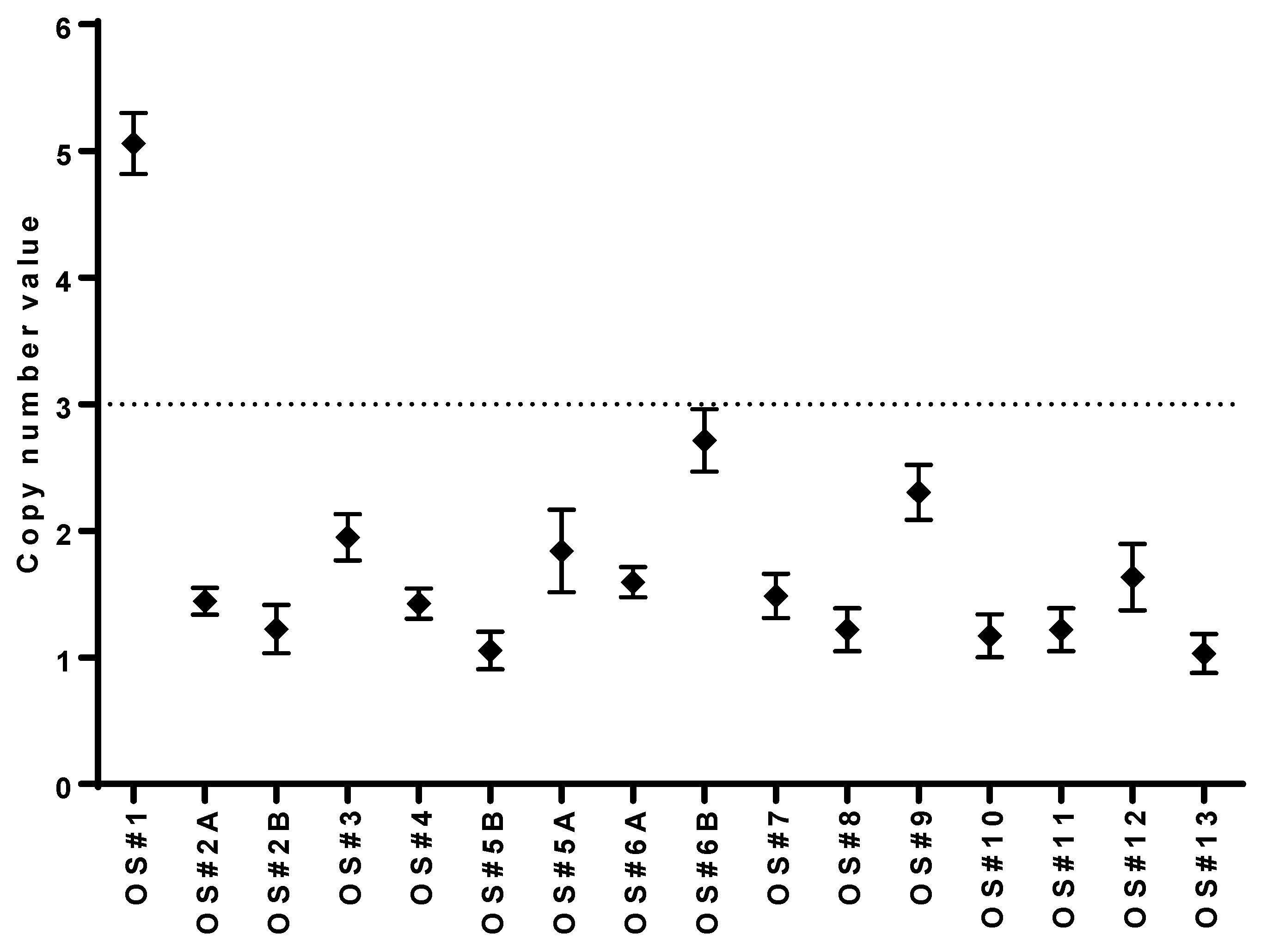 OS#12 presented the highest number of gains, including LZTR1, TRAF7, ERBB3, CDK4, and CCND3 (Figure 2). CCNE1 gain was seen in two OS samples (OS#8 and OS#10). Unexpectedly, MYC gain, frequently reported in advanced OS patients [12], was not detected in any of the 6 OS patients analyzed in this setting, and also considering the 7 OS patients of the previous group, its frequency was very low (1/13, corresponding to 8%).