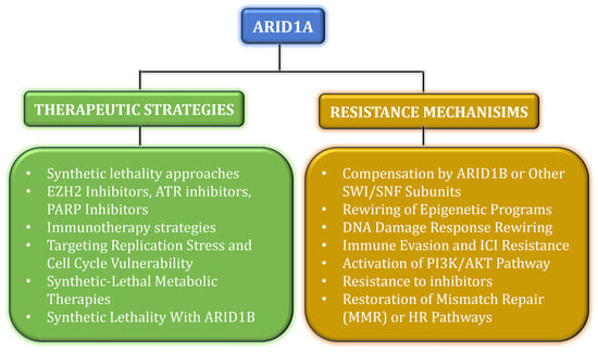 The schematic representation shows the therapeutic approaches in green and the resistant mechanisms in mustard for ARID1A.