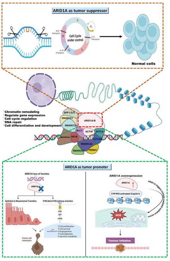 The graphical illustration represents ARID1A as a tumor suppressor, a key subunit of SWI/SNF remodeling complex that maintains DNA repair, and ARID1A’s role in genome regulation and context-dependent consequences. ARID1A as a tumor suppressor controls cell cycle and maintains genome stability, whereas at the bottom, featuring ARID1A as a tumor promoter, the left panel shows that ARID1A’s divergent dysregulation loss of function promotes oncogenesis through EMT and PI3K/AKT/mTOR activation, leading to cancer cell metastasis; the right panel shows that ARID1A’s overexpression promotes oncogenesis via CYP450-mediated ROS generation and initiates the tumor.