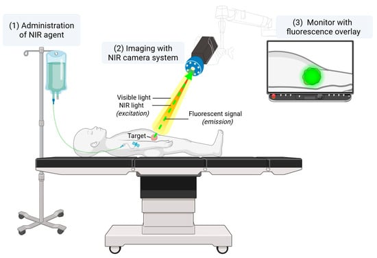 A schematic overview of a clinical FGS setup. A NIR fluorescent agent is administered intravenously or locally, either preoperatively or intraoperatively. The NIR camera system enables visible light as well as NIR light, which excites the fluorescent agent. The emitted light is then captured by the camera and displayed in real time on a monitor.