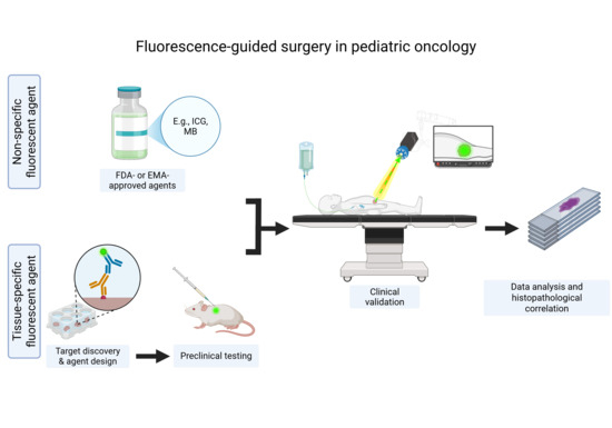 - Goldstein, S.D.; Heaton, T.E.; Bondoc, A.; Dasgupta, R.; Abdelhafeez, A.; Davidoff, A.M.; Lautz, T.B. Evolving Applications of Fluorescence Guided Surgery in Pediatric Surgical Oncology: A Practical Guide for Surgeons. J. Pediatr. Surg. 2021, 56, 215–223. [Google Scholar] [CrossRef]