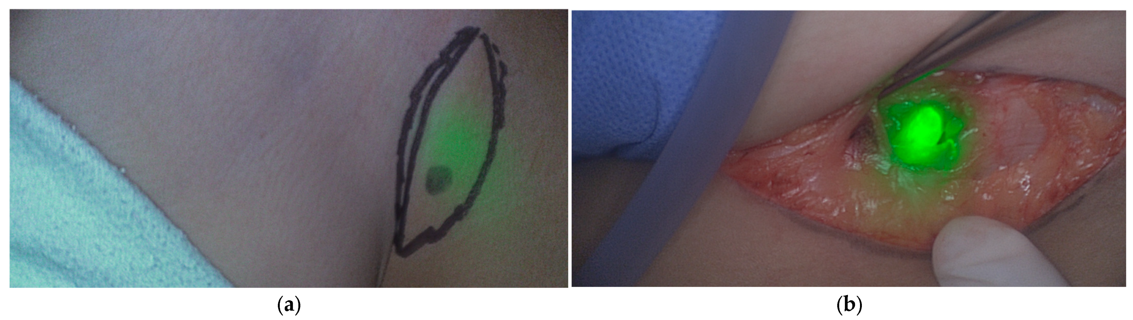 - Cimmino, V.M.; Brown, A.C.; Szocik, J.F.; Pass, H.A.; Moline, S.; De, S.K.; Domino, E.F. Allergic Reactions to Isosulfan Blue during Sentinel Node Biopsy--a Common Event. Surgery 2001, 130, 439–442. [Google Scholar] [CrossRef] [PubMed]