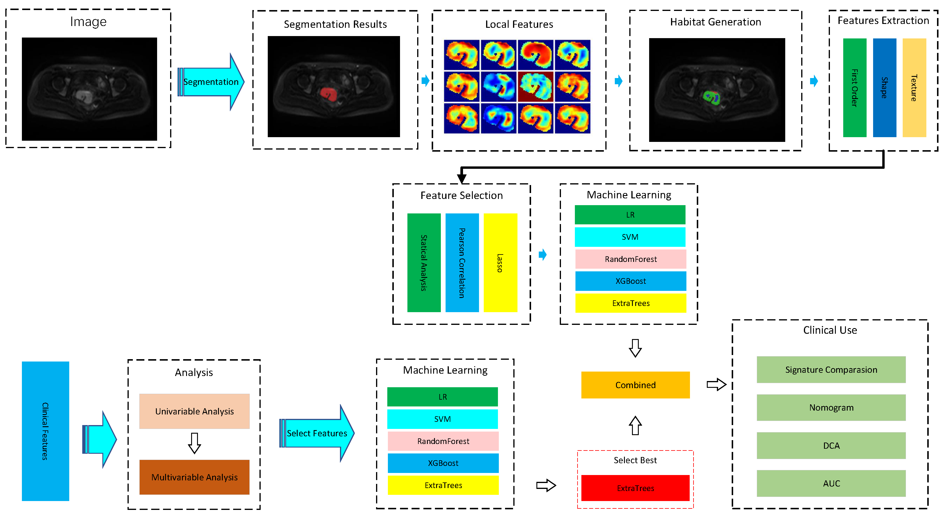 - Development of a habitat radiomics framework for cervical cancer. By applying unsupervised K-means clustering to preoperative -weighted images (WI) and diffusion-weighted images (DWI), we generated intratumoral subregions within the region of interest (ROI). These subregions capture spatial heterogeneity that cannot be represented by whole-tumor radiomics, thereby providing complementary biomarkers for LNM prediction [10,11];