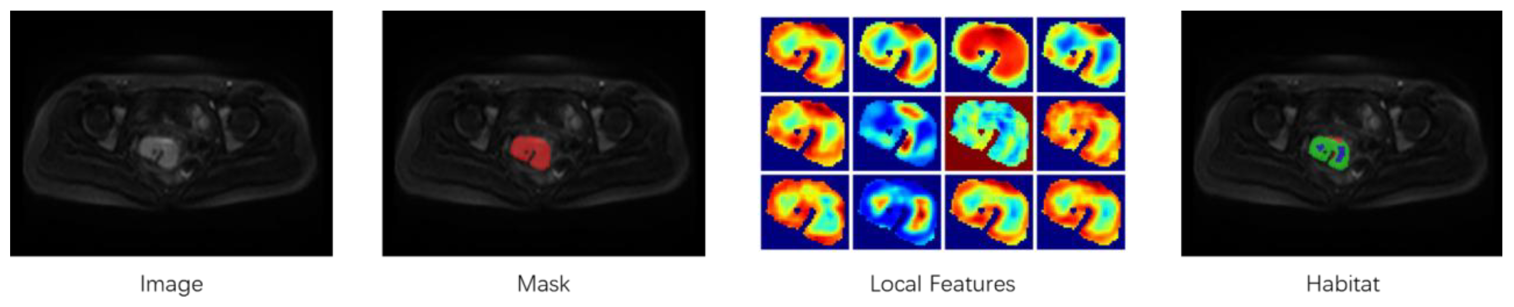 - Habitat-based radiomic features, capturing spatially heterogeneous subregional imaging signatures;