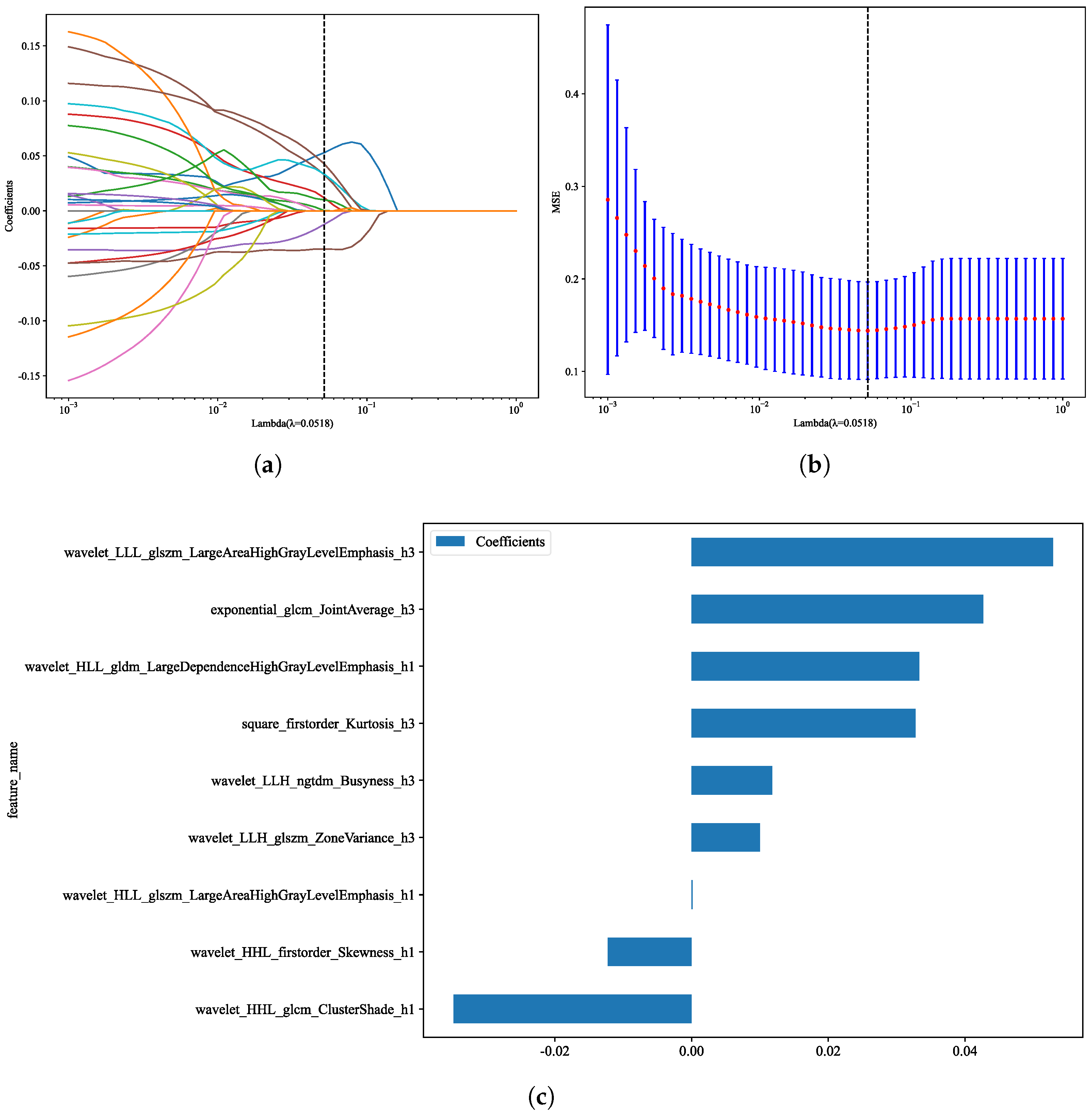 - Robust feature extraction and selection. Following IBSI guidelines [12], we extracted more than 1000 features, including morphological descriptors, first-order statistics, and texture metrics. After Z-score normalization, redundancy was reduced through correlation analysis, and a stable subset of features was selected using least absolute shrinkage and selection operator (LASSO) regression [13]. These features demonstrated high reproducibility and robustness for model construction;