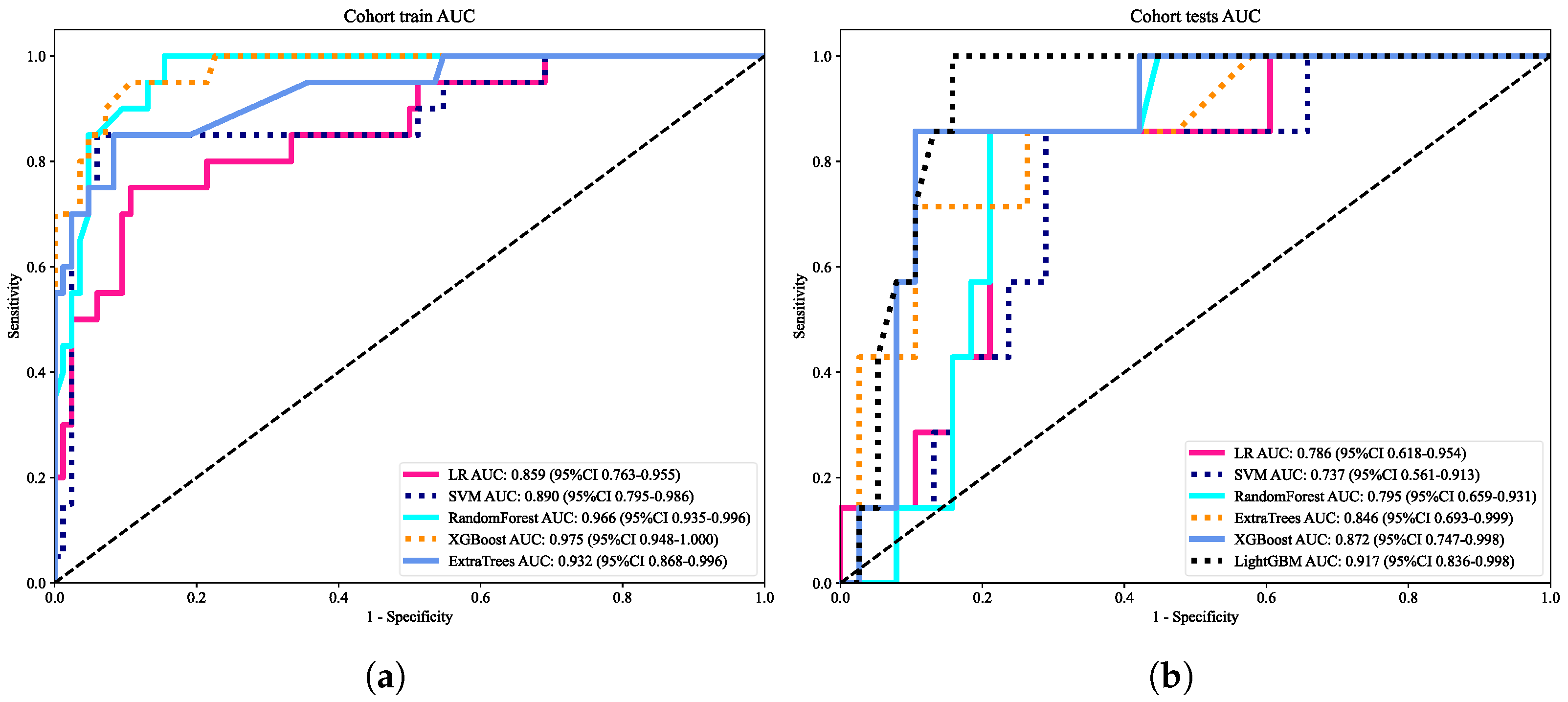- DeLong, E.R.; DeLong, D.M.; Clarke-Pearson, D.L. Comparing the areas under two or more correlated receiver operating characteristic curves: A nonparametric approach. Biometrics 1988, 44, 837–845. [Google Scholar] [CrossRef]